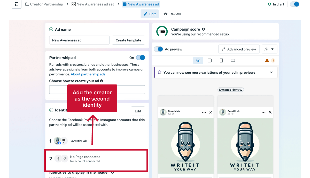 Partnership ads are created in Meta Ads Manager and follow the standard campaign setup process, with an additional step to add the creator identity.Â