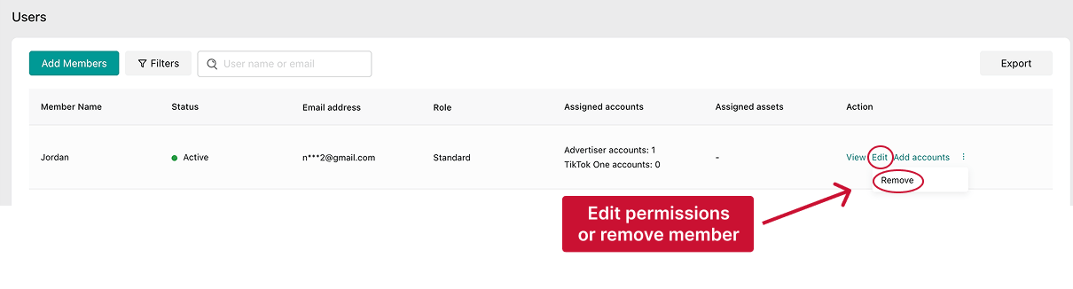 TikTok also lets you assign users access to specific accounts or assets. These permissions provide precise control over what they can do within each asset.