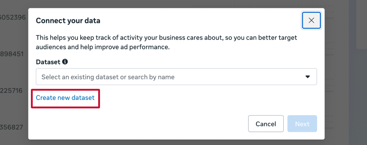 Step 3. Meta will ask you to connect to an existing dataset. If youâre new to Events Manager, choose âCreate new dataset.â
