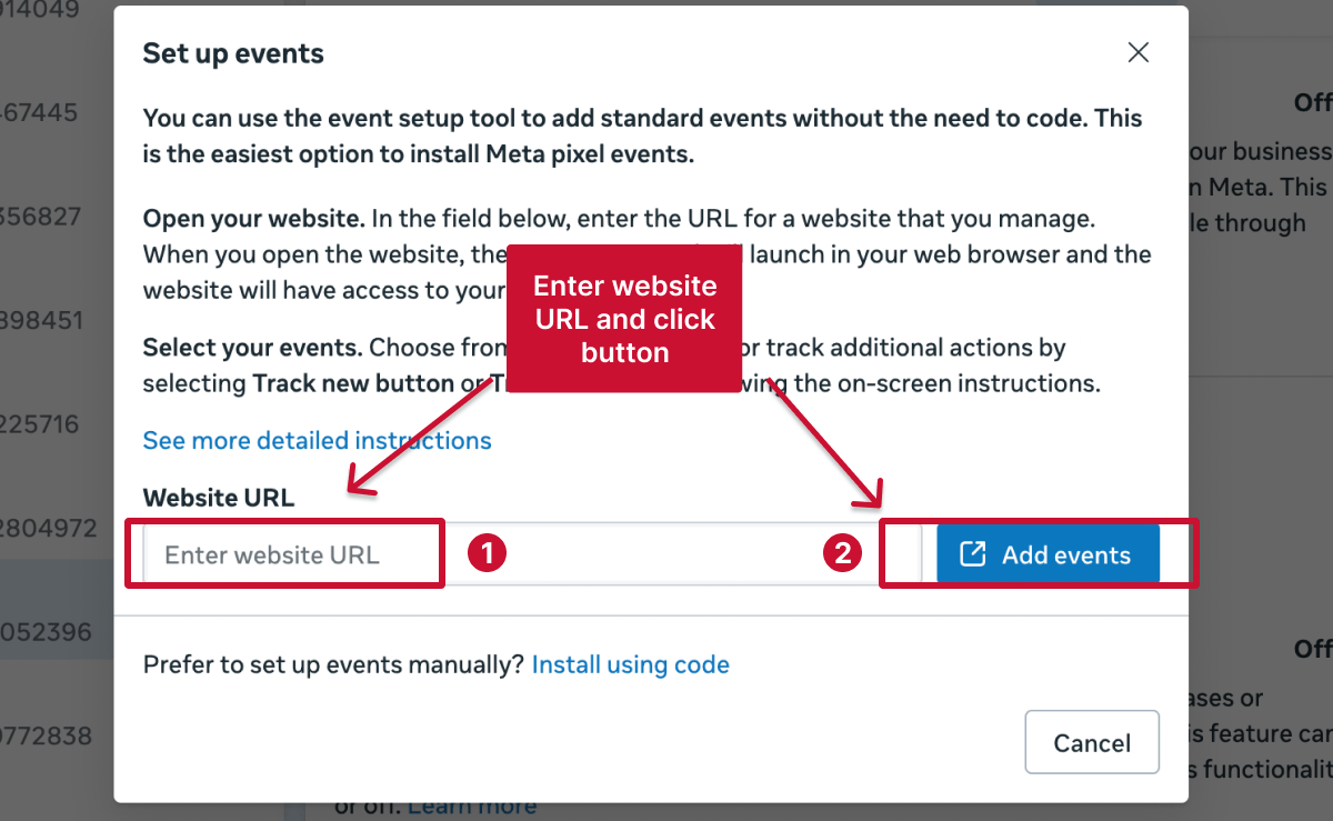 If you choose manual setup, youâll be guided to Metaâs Event Setup Tool to create your events.