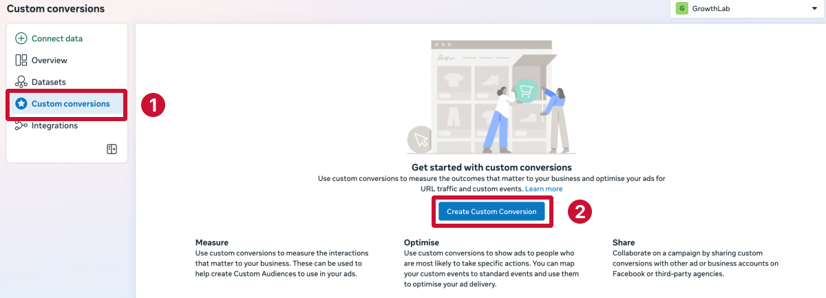 Step 1. Go to Meta Events Manager, then click âCustom conversionsâ and select âCreate custom conversion.â