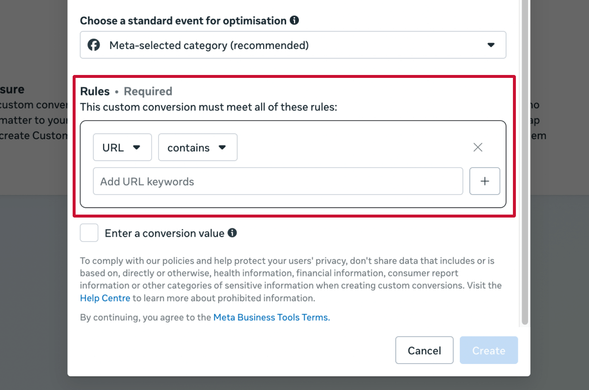 Step 3. Add rules to define what counts as a conversion. For example, you might track conversions only when someone reaches a thank-you page or a specific product URL.
