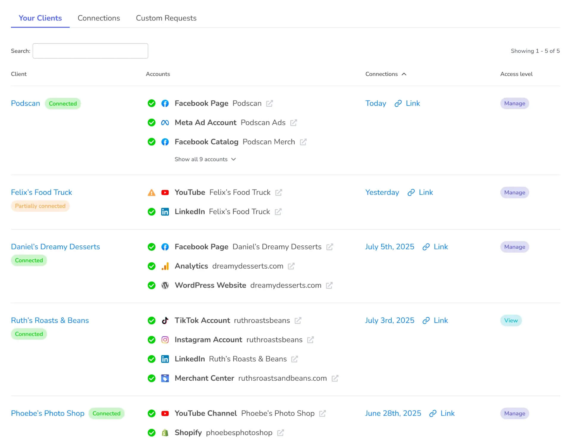 For Google, you can get manage or view-only access to Business Profile (formerly Google My Business), Google Analytics, Google Ads (including Manager account / MCC support), Tag Manager, Search Console and Merchant Center.